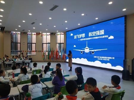 活动开始首先播放了航空工业宣传片,让孩子们对新中国航空工业的发展历程和航空工业建设者的初心有了感知。随后,来自人力资源部、科技部、技术中心的5位讲师分别为同学们进行科普授课。张超、张博华讲解了《早期航空探索》《航空基础知识》《航空器构造》《中国航空工业发展历程》等科普知识,解开孩子们心中飞机飞行的秘密;吴晶晶通过自己的亲身经历来讲述《航空梦》,让航空强国的梦想、航空英模的精神在同学们的心中扎根发芽。